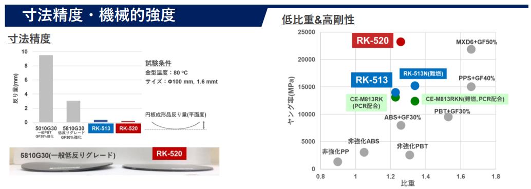 低比重&高剛性を両立、更に低反り性に優れた材料で、成形品の寸法精度向上にも貢献します。